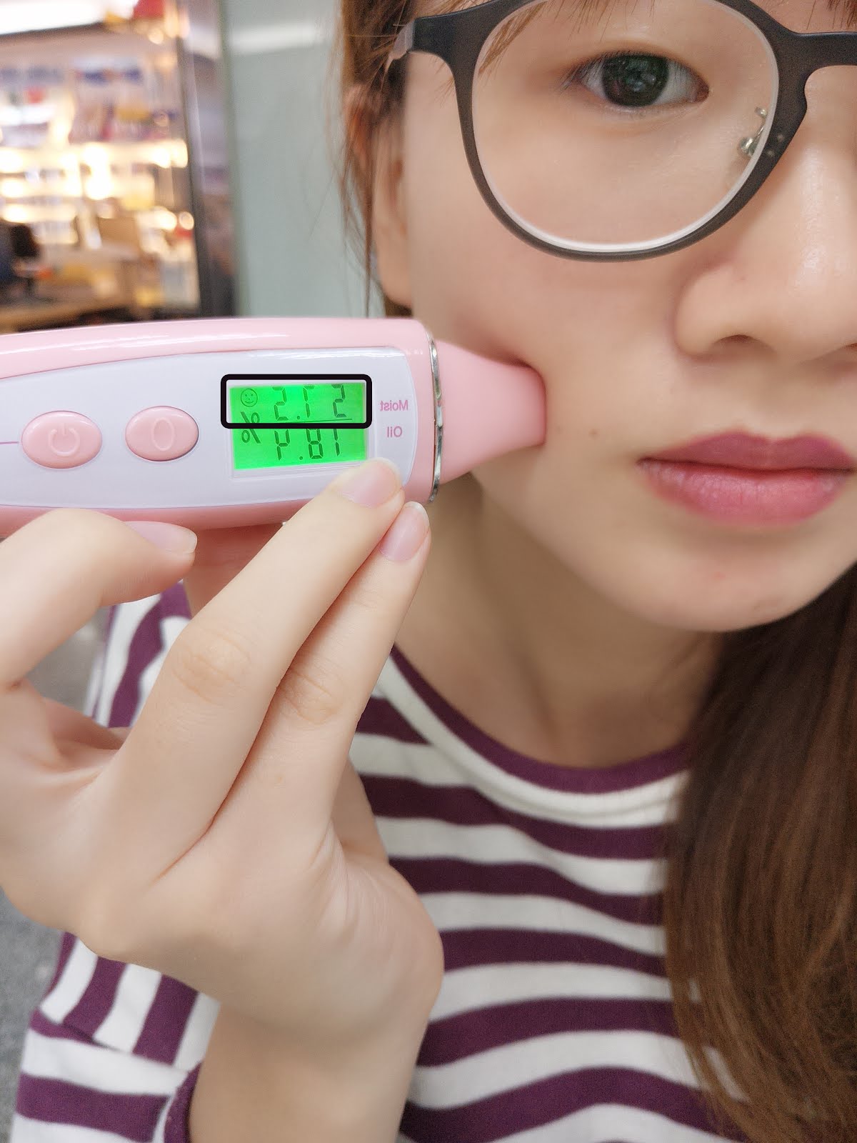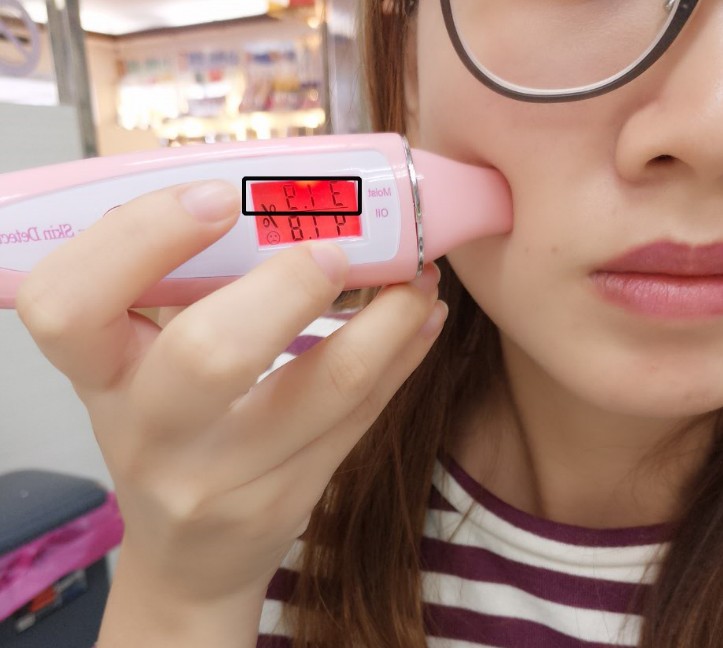 你們看看,我用肌膚檢測儀測試臉部水分,竟然只有31.9,而且還呈現紅色警報,左下角還出現一個??符號,真的好乾??